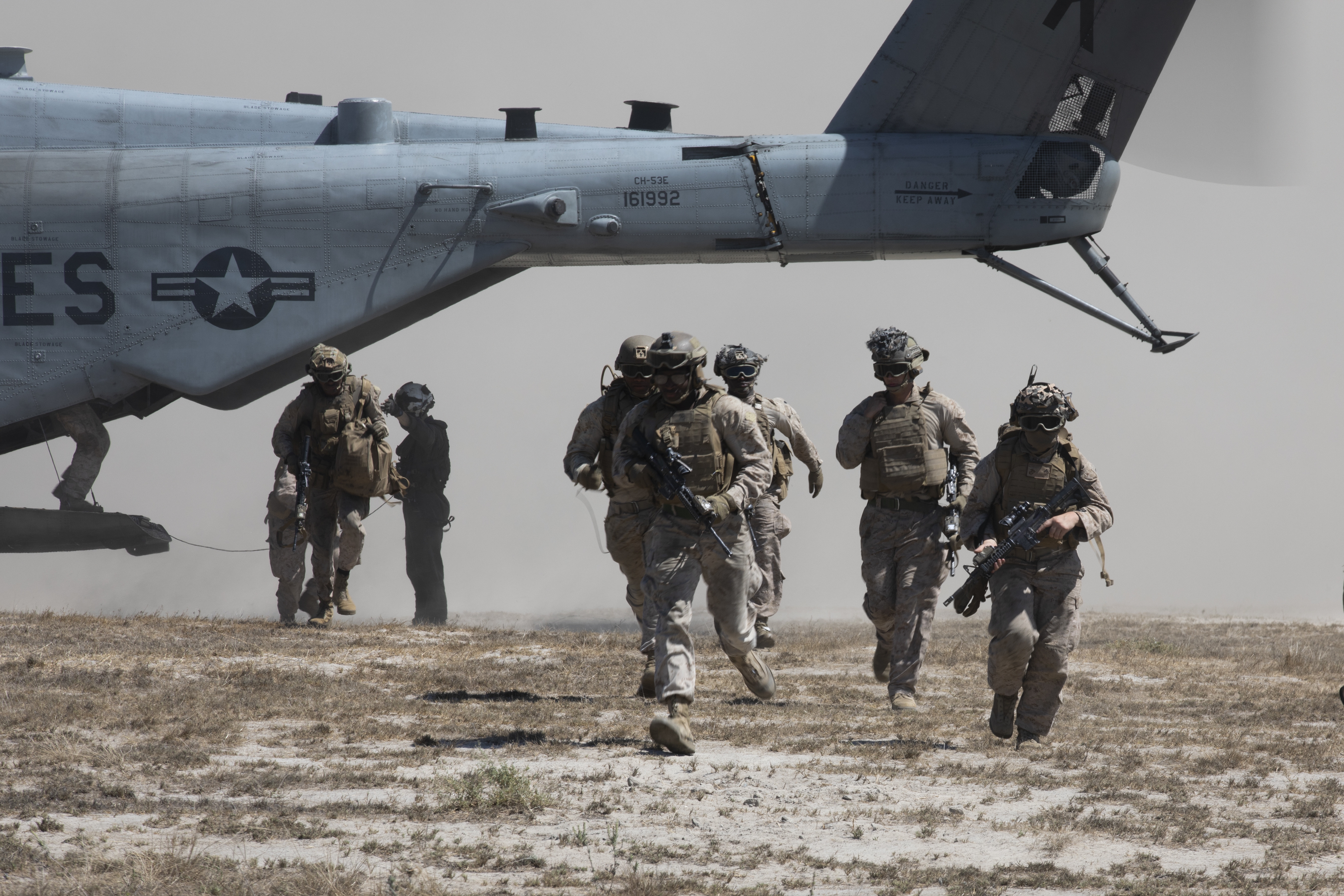 U.S. Marines assigned to Charlie Battery, 1st Battalion, 11th Marine Regiment, 1st Marine Division, exit a CH-53E Super Stallion helicopter assigned to Marine Heavy Helicopter Squadron (HMH) 465, Marine Aircraft Group 16, 3rd Marine Aircraft Wing, during a helo raid as part of Exercise Cobra Fury 25.5 at Marine Corps Base Camp Pendleton, California, Sept. 11, 2025. Cobra Fury 25.2 is an annual exercise designed to improve the battalion’s ability to deploy artillery and M142 High Mobility Artillery Rocket Systems to provide accurate, long-range fire in key terrain. (U.S. Marine Corps photo by Lance Cpl. Diego Berumen)