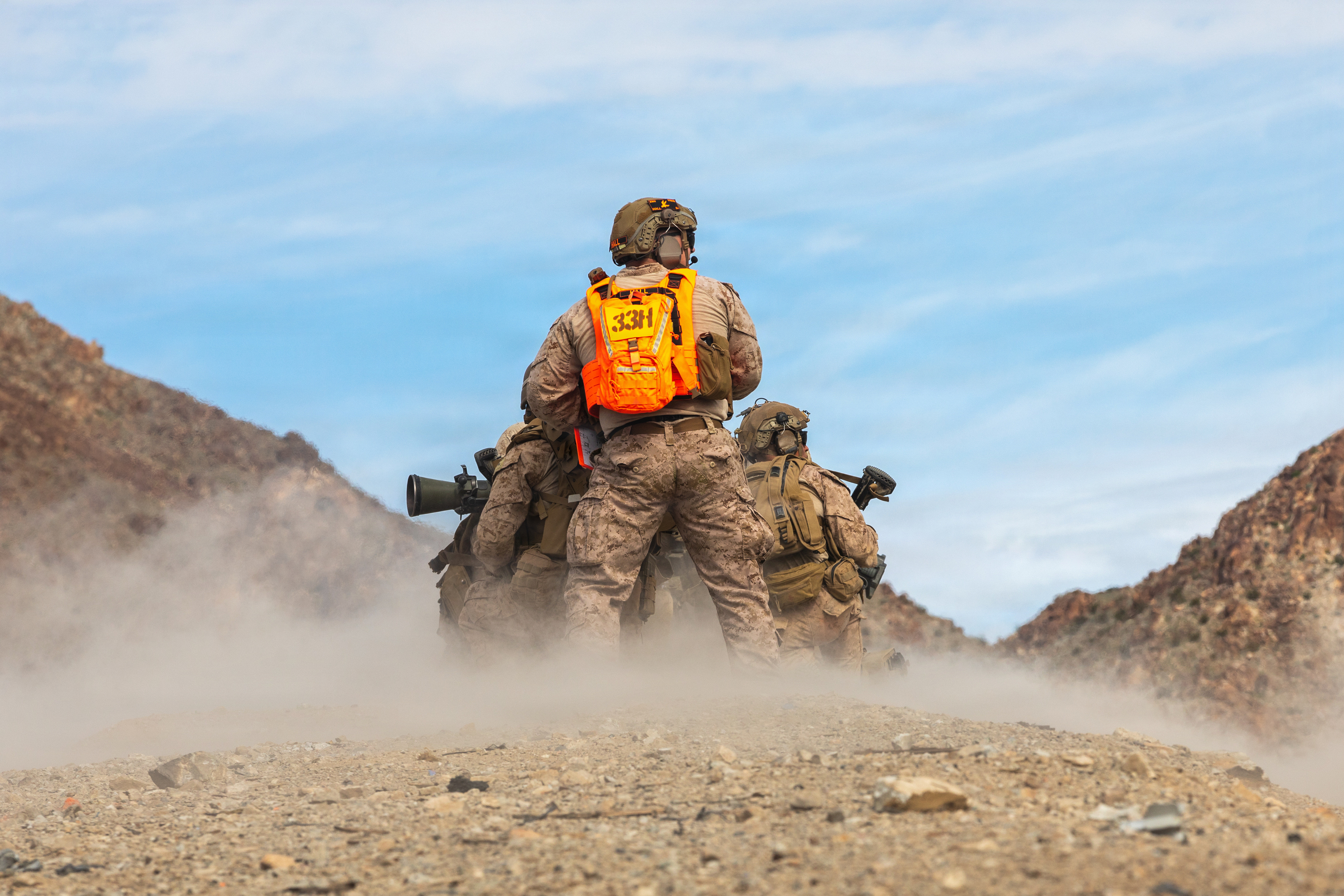 U.S. Marines with Fire Support Battalion, 11th Marine Regiment, 1st Marine Division, hike to their next station during the company fire support team competition at Marine Corps Base Camp Pendleton, California, Sept. 19, 2025. The company FST competition tests teams’ technical and tactical skills under stress, building proficiency, teamwork, and readiness to integrate fires effectively in combat. (U.S. Marine Corps photo by Sgt. Atticus Martinez)