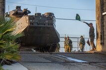 A U.S. Marine gives the Japan Ground Self-Defense Force Soldiers with 1st Amphibious Rapid Deployment Regiment, the go ahead for the assault amphibious vehicles to enter the water and travel to the USS Somerset (LPD 25) during Iron Fist 2019, Jan. 30 on U.S. Marine Corps Base Camp Pendleton, CA.